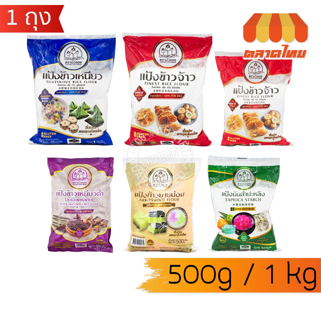 แป้งทำขนม ตราบัวลอย แป้งข้าวเหนียวดำ, ข้าวจ้าว, มันสำปะหลัง, แป้งท้าวยายม่อม 500g. / 1 Kg. ราคา 22 ฿. (4.9) อัพเดทล่าสุด 15/04/2026 09:06