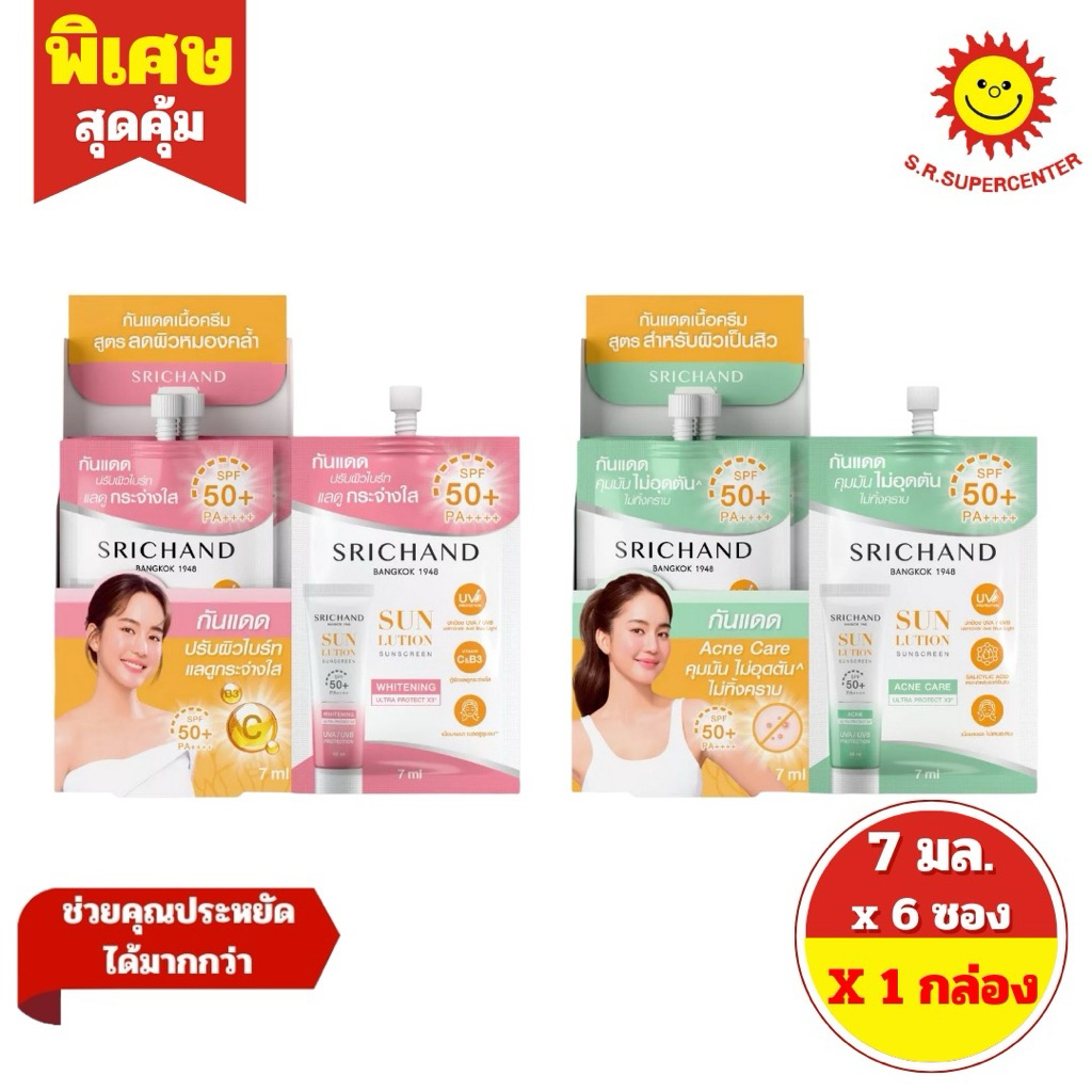 [1กล่อง]ศรีจันทร์ ครีมกันแดด ซันลูชั่น ซันสกีน SPF50+ PA++++ กล่อง6ซอง/ขนาด7มล. ราคา 135 ฿. (4.9) อัพเดทล่าสุด 15/04/2026 12:08