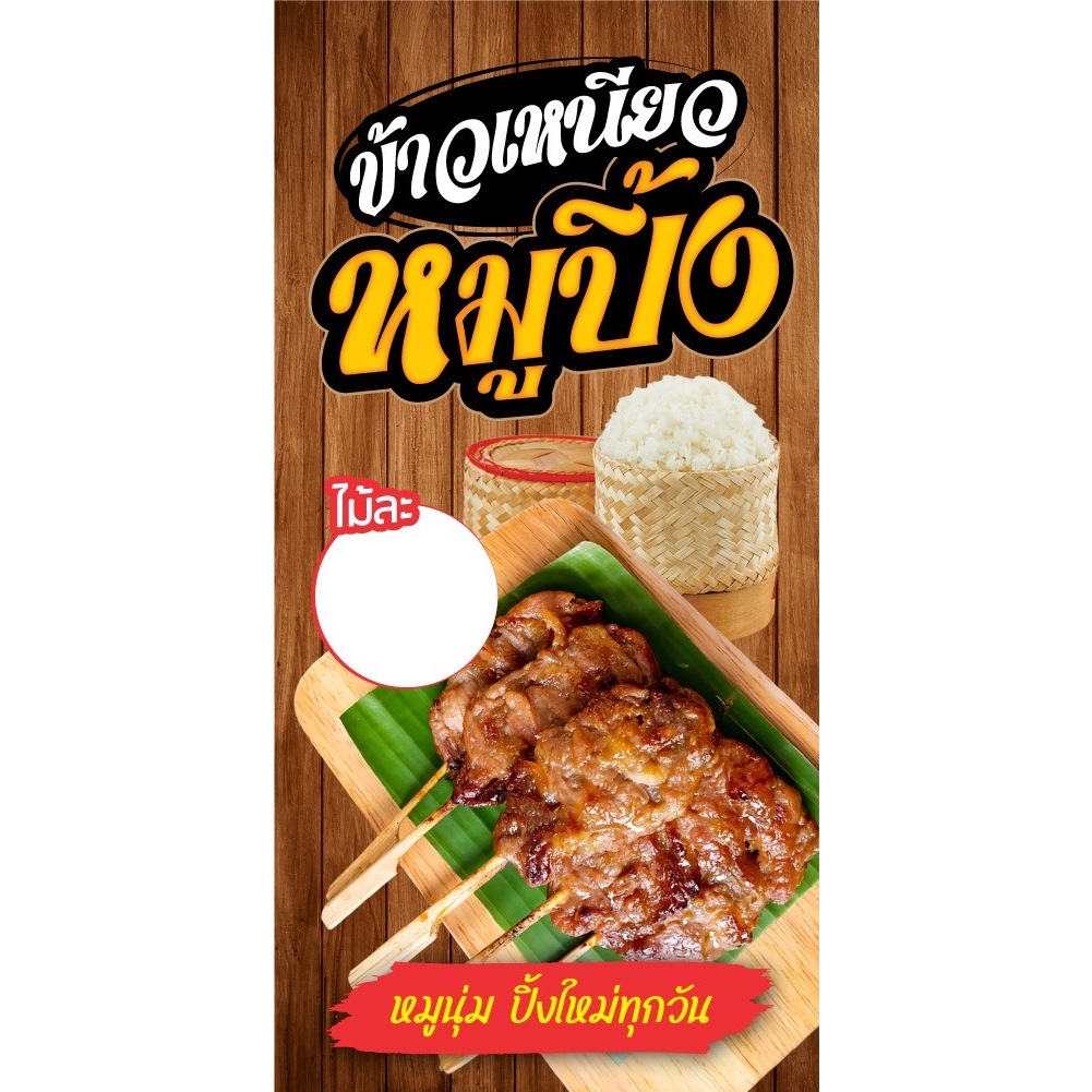 ป้ายไวนิล ข้าวเหนียวหมูปิ้ง แนวตั้ง-แนวนอน ขนาด 50x100 ซม.ตาไก่ 4 มุม ป้ายโฆษณา พิมพ์ป้ายร้านค้า ป้ายสติกเกอร์ ราคา 85 ฿. (5.0) อัพเดทล่าสุด 04/04/2026 18:04