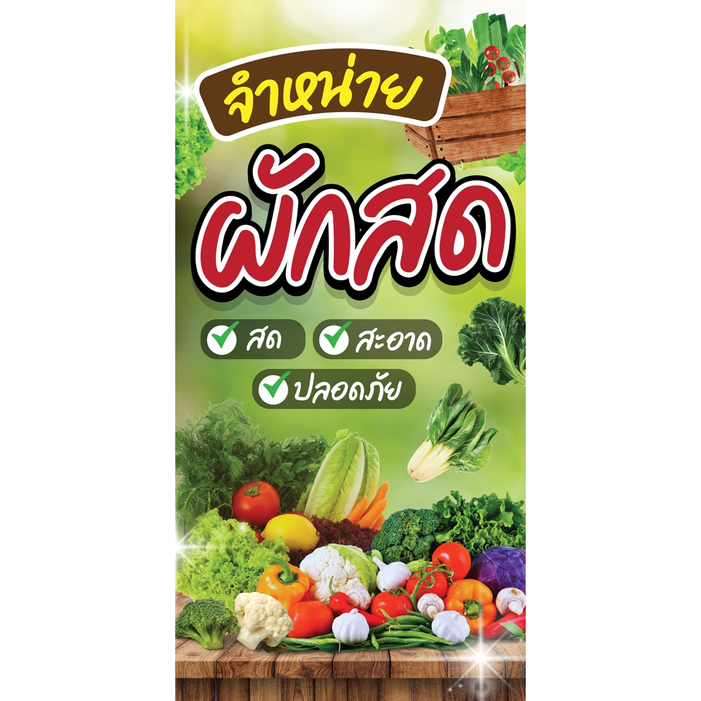 ป้ายไวนิล ผักสด แนวตั้ง-แนวนอน ขนาด 50x100 ซม.ตาไก่ 4 มุม ป้ายโฆษณา ป้ายอิงค์เจ็ท พิมพ์ป้ายร้านค้า ป้ายสติกเกอร์ ฉลากสิ ราคา 85 ฿. (4.8) อัพเดทล่าสุด 04/04/2026 12:04